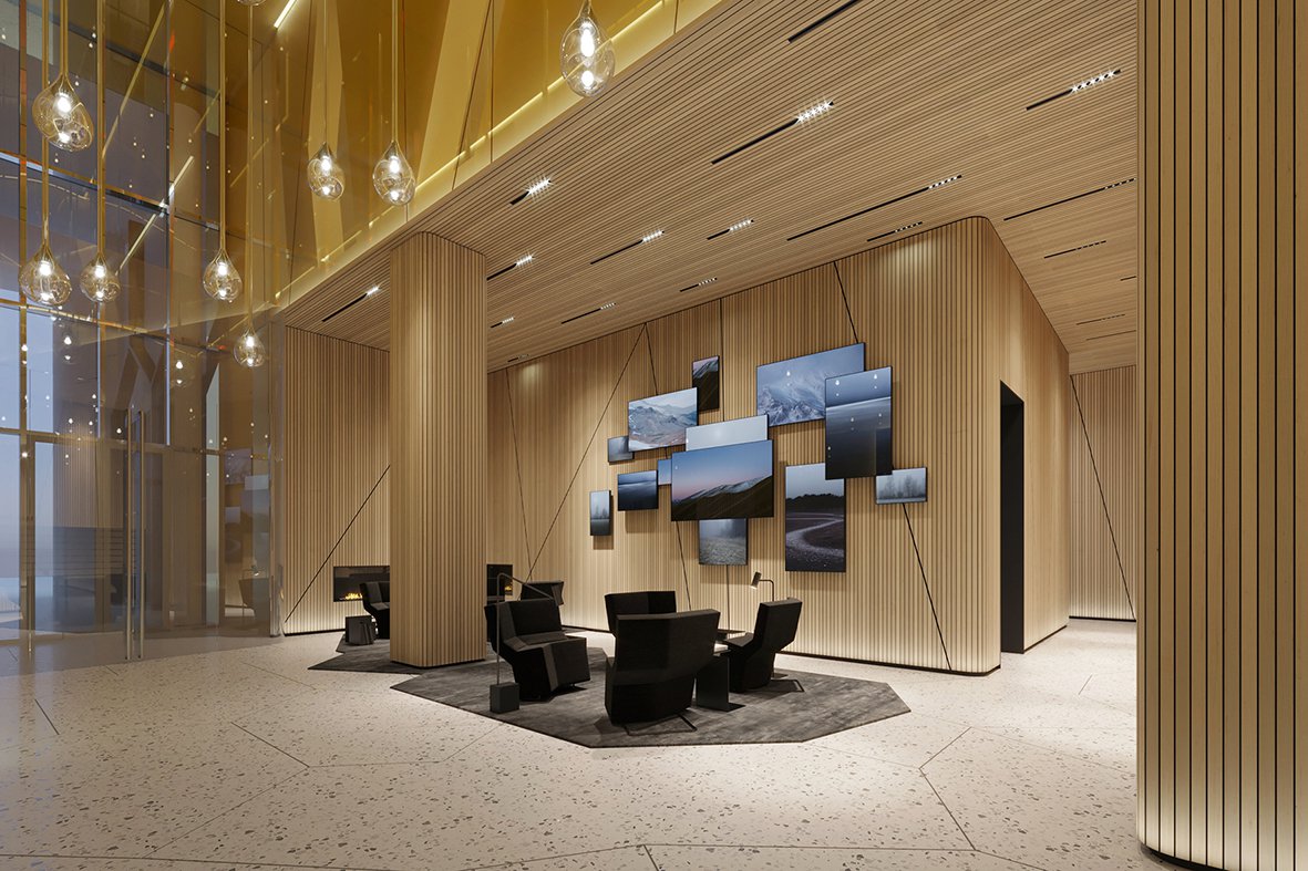 В лобби расположена рецепция, просторная зона ожидания и встреч с массивными креслами и встроенным биокамином, комната охраны, а также вспомогательные помещения. Арт-композиция из жк-дисплеев на центральной стене позволяет проецировать любой контент и оживляет пространство.